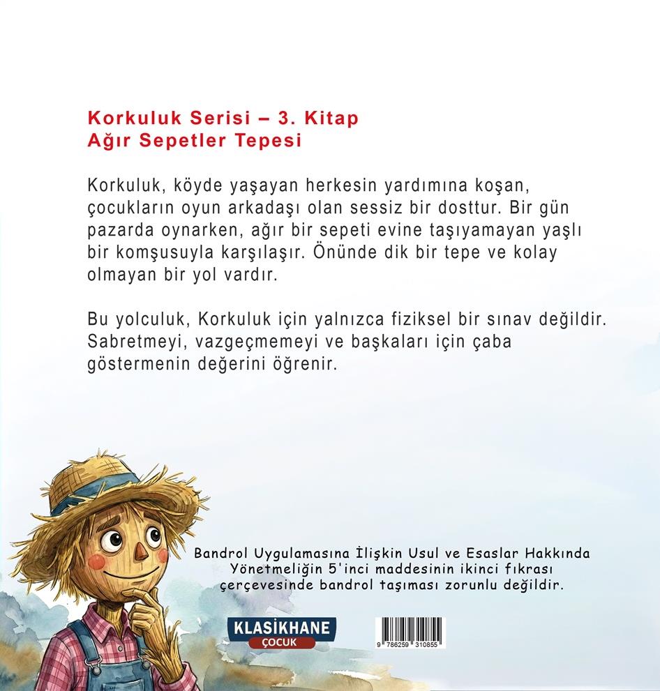 Korkuluk Serisi – Ağır Sepetler Tepesi, çocuklara yardımlaşmanın, sorumluluk almanın ve azimle ilerlemenin önemini sade ama etkileyici bir anlatımla sunar. Günlük hayatın içinden gelen bu sıcak hikâye, küçük bir iyiliğin bile büyük anlamlar taşıyabileceğini gösterir.